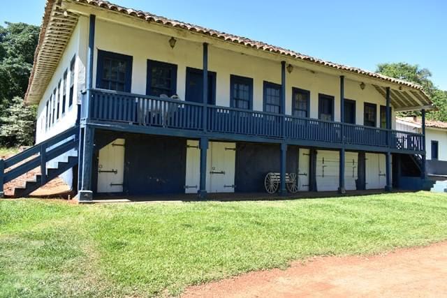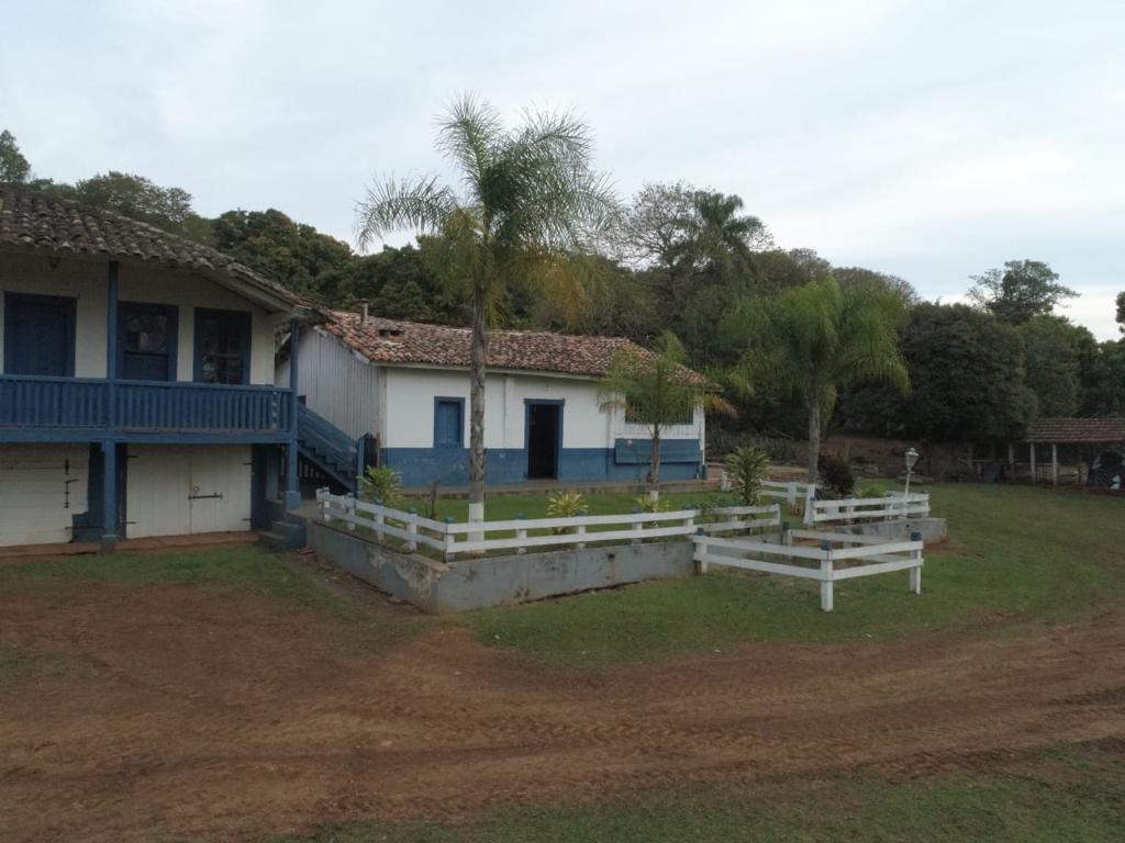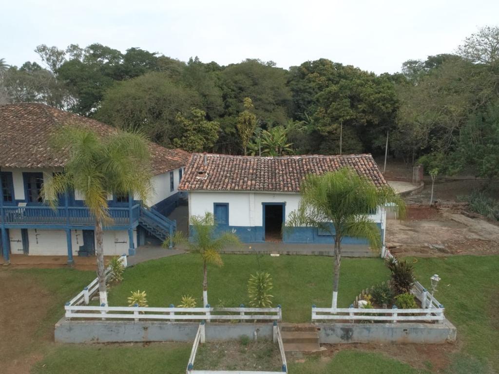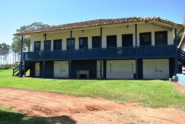Propriedade rural com casarão histórico, casa para caseiro, galpão e estrutura para confinamento de animais.